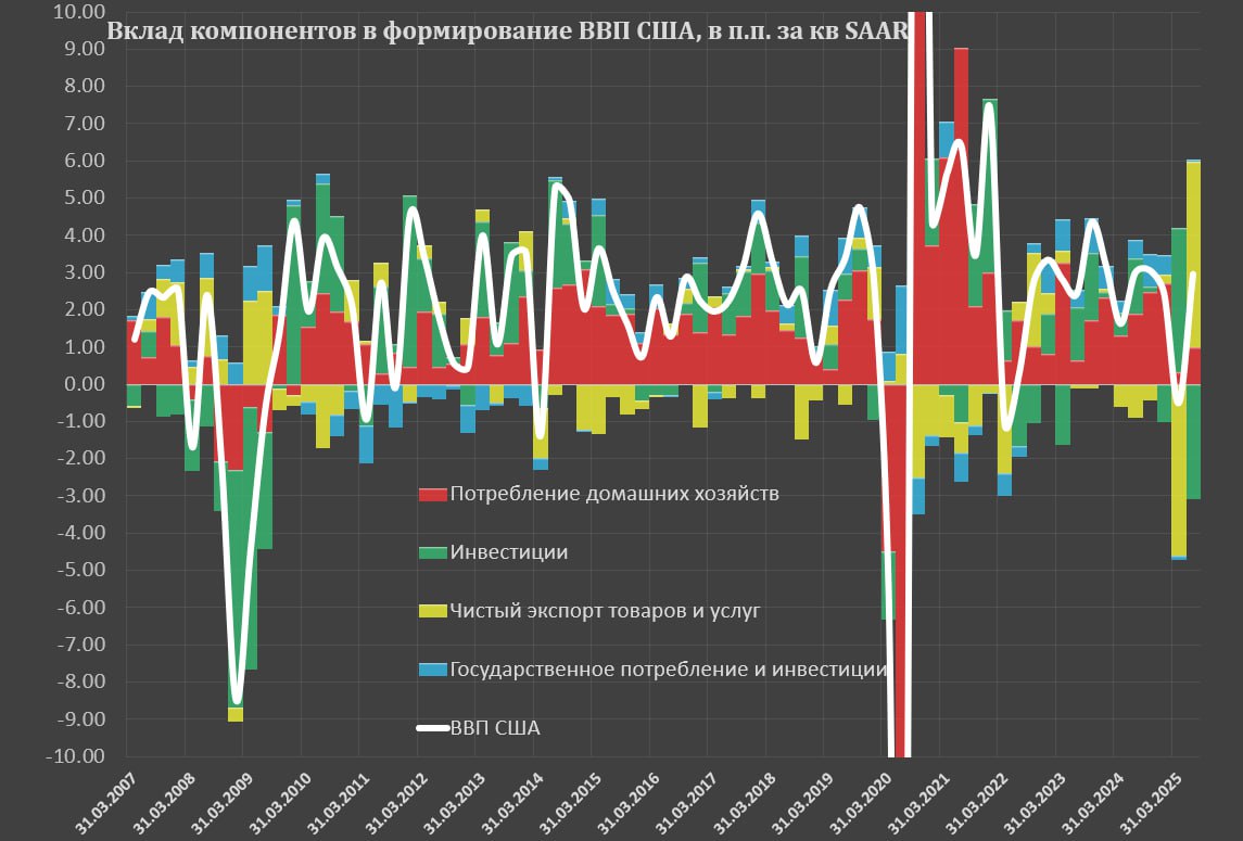 Первичные данные по ВВП США вроде неплохие – 3% роста кв/кв SAAR после снижения на 0.5% в 1кв25, но на самом деле – все это фикция, обман, эти данные не должны вводить в заблуждение. Все весьма плохо.