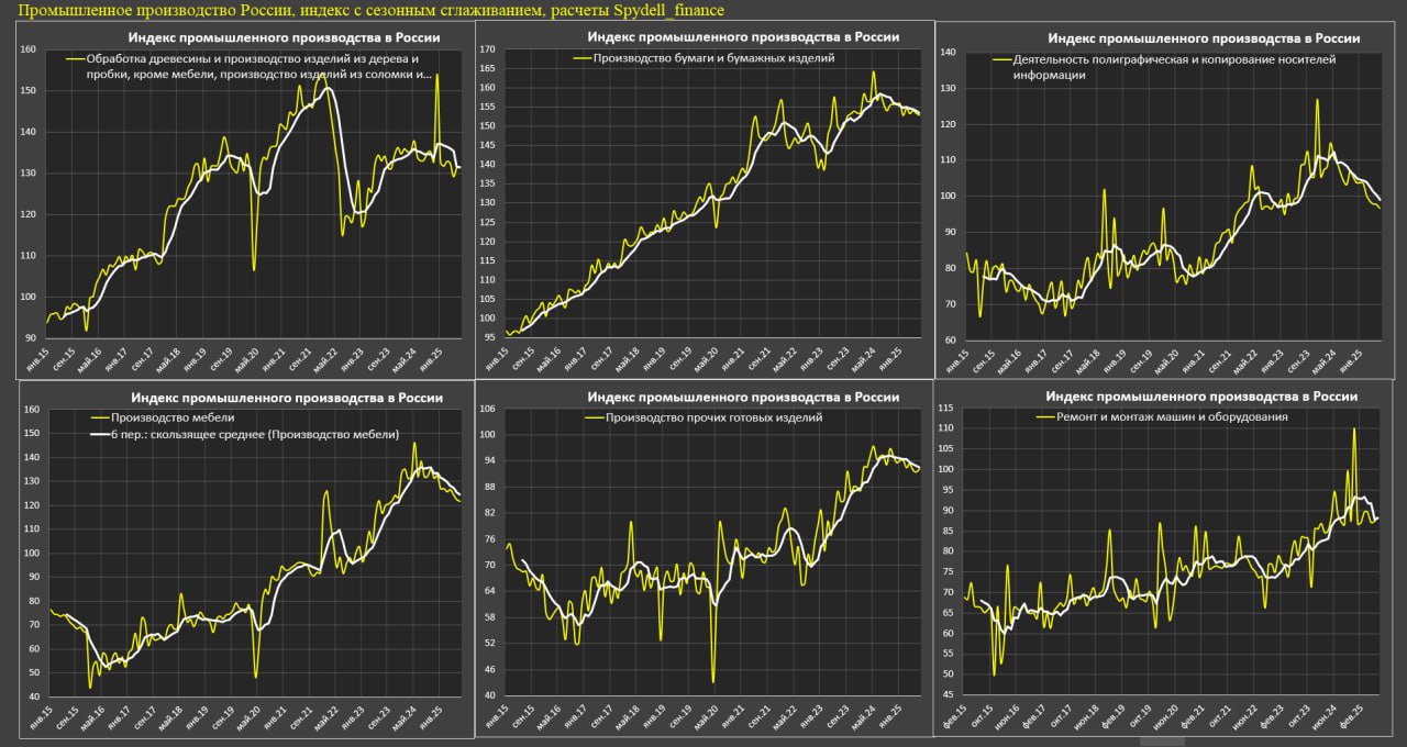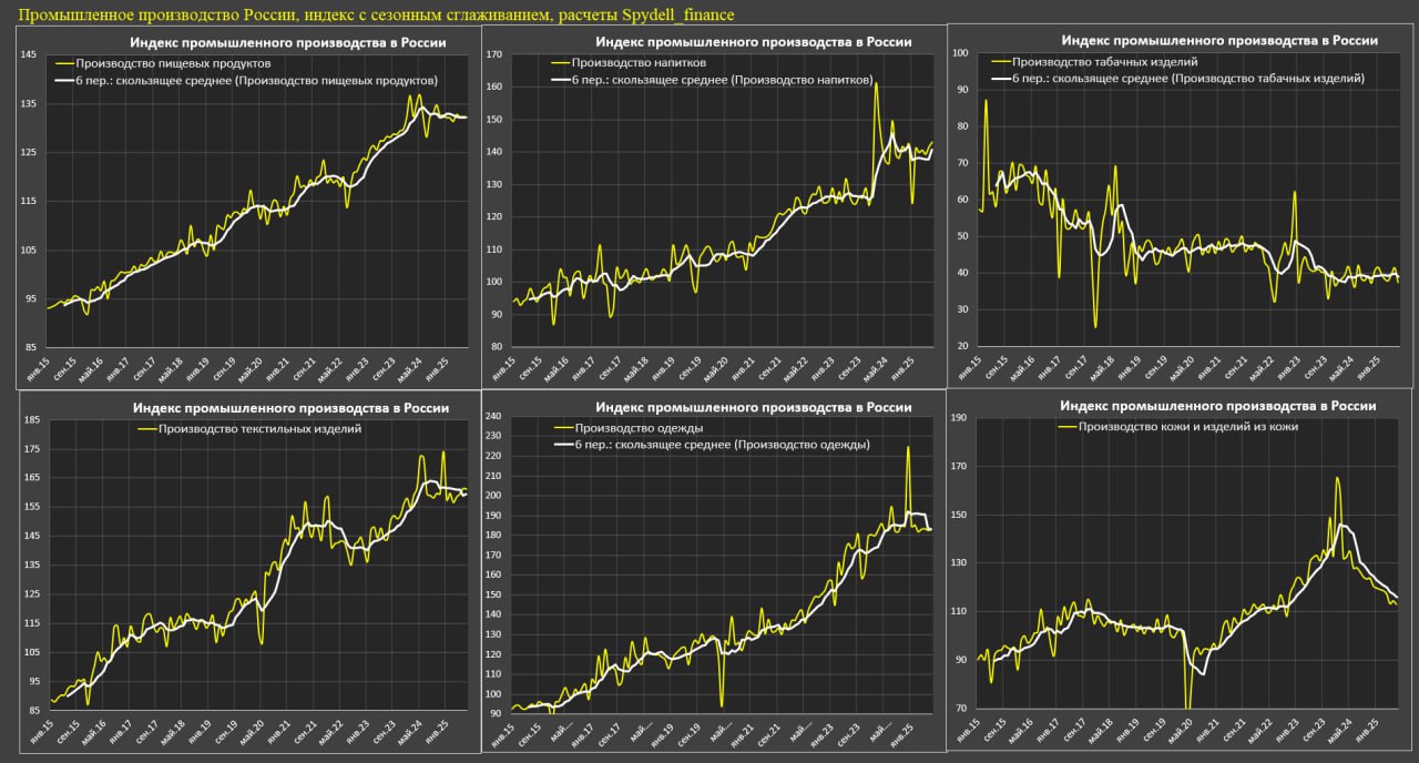 С исключением сезонного фактора за последние 3 месяца в сравнении с 4кв24: производство прочих транспортных средств и оборудования растет на 17.9%, производство готовых металлических изделий (оружие и боеприпасы) растет на 5.6%, а производство лекарство +3%.