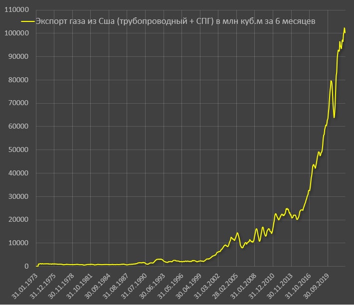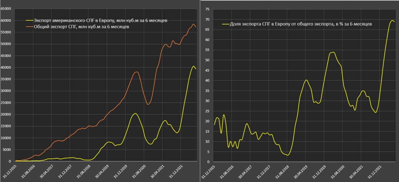 Сейчас США в Европу поставляет около 40 млрд кубов СПГ за 6 месяцев – это составляет 70% в структуре общемировых поставок американского СПГ – максимальная доля Европы за все время.