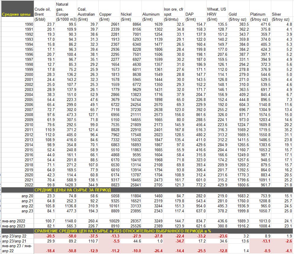 Что касается фокуса по краткосрочной динамике номинальных цен на сырье? За январь-апрель 2023 существенное снижение год к году по всей товарной группе (подробности в таблице), где снижение будет усиливаться, как минимум до июня 2023 из-за эффекта базы.