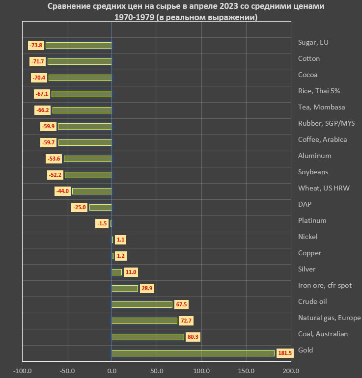 Средние цены в апреле (в реальном выражении) по сравнению со средними ценами в период с 1970 по 1979 по сахару – потери почти в 4 раза, аналогичный расклад по хлопку и какао, цены на рис и чай упали в три раза за 50 лет! Снижение на 60% отмечается в кофе, и существенные потери (более, чем в два раза) по алюминию и соевыми бобам. Цены на пшеницу за полвека снизились на 44%, а на удобрения – минус 25%.
