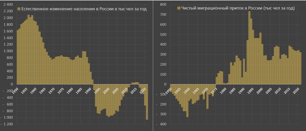 Соответственно, действуют сразу две негативные тенденции – ужасающая демография, обусловленная рекордно низкой рождаемостью и высокой смертностью, плюс к этому отрицательная чистая миграция, зафиксированная впервые в истории России.