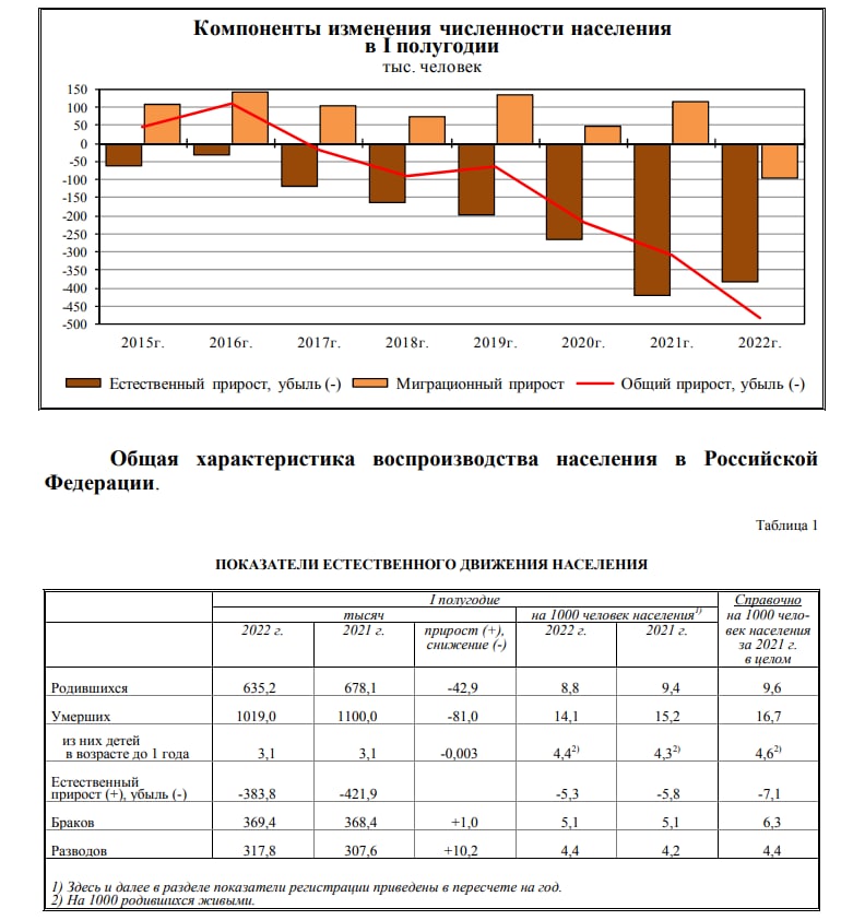 Во-первых, это запредельная естественная убыль населения, которая составляет 384 тыс чел за первые 6 месяцев 2022 по сравнению с убылью в 422 тыс за первое полугодие 2021, но по естественной убыли 2021 год стал худшим в современной истории России и худшим со времен Второй Мировой!