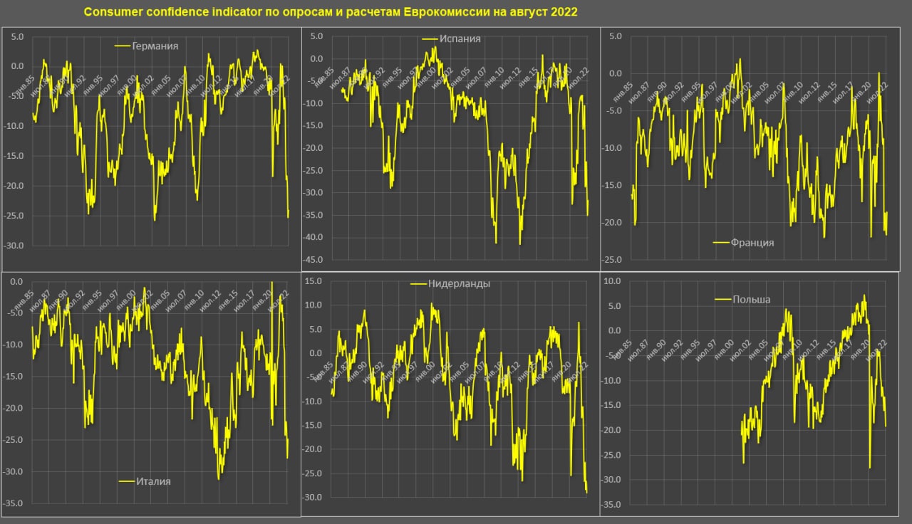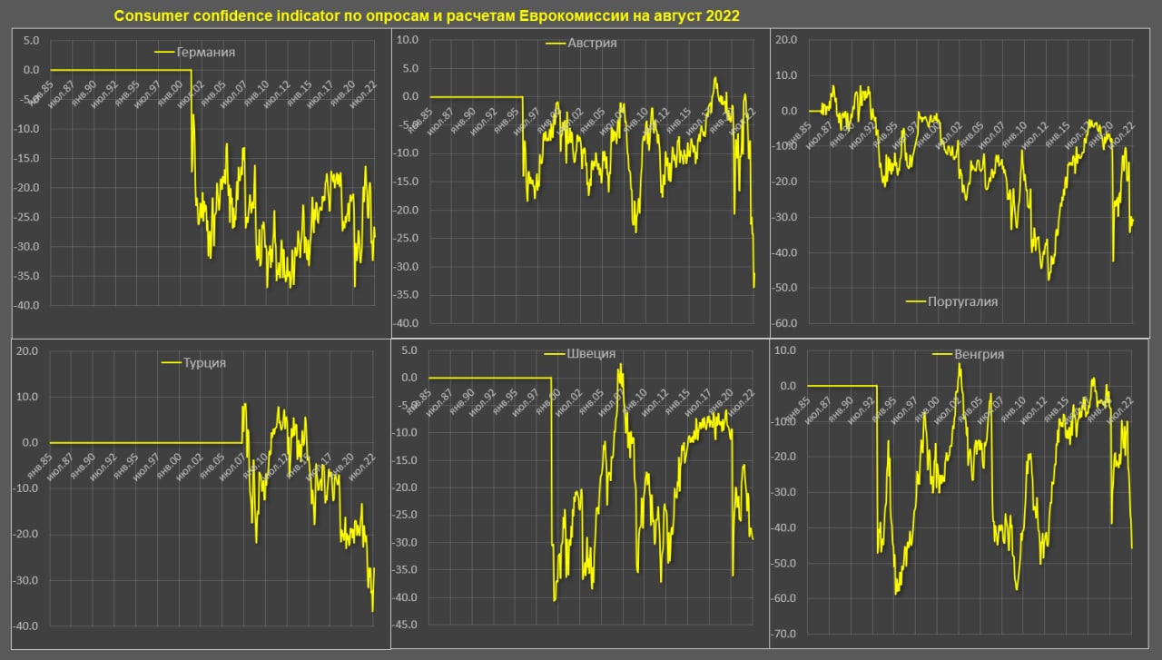 Уже не осталось островков стабильности – падают все страны (кто-то быстрее, кто-то медленнее), но вектор определен. На графиках индекс потребительского доверия по странам Европы и Турции в соответствии с опросами и расчетами Еврокомиссии по данным на август 2022.