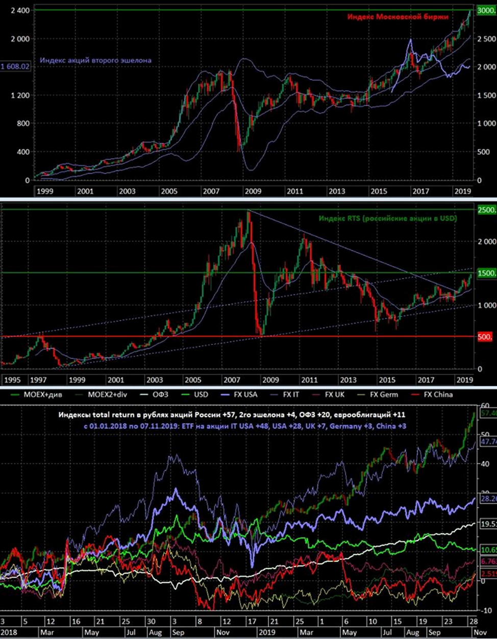 Вроде совсем недавно, в сентябре 2016, переписывали максимум 2008 и 2000 пунктов. И это, казалось, много. А сейчас новый исторический уровень и, думаешь, ну куда еще? Впервые за многие годы цены российских акций очень близки к целевым уровням - по индексу это ~3200. Даже сокращая долю акций в своих портфелях, понимаешь, что хайпа еще не случилось, многие пропустили рост и будут ещё заходить. Следующая цель - максимум 2008 по индексу РТС в долларах США - до него еще ~70%. Нормальным темпом ~10% в год дойдем к 2025. Плюс дивиденд ~5% и доходность ~15% выглядит очень привлекательной по мировым меркам. За два года российские акции принесли доходность выше, чем другие классы активов - выше вечно растущего IT-сектора США. Сильно отстал второй эшелон в России, почти не рос эти два года, - за ним тоже придут рано или поздно. А какова доля российских акций в ваших портфелях?!