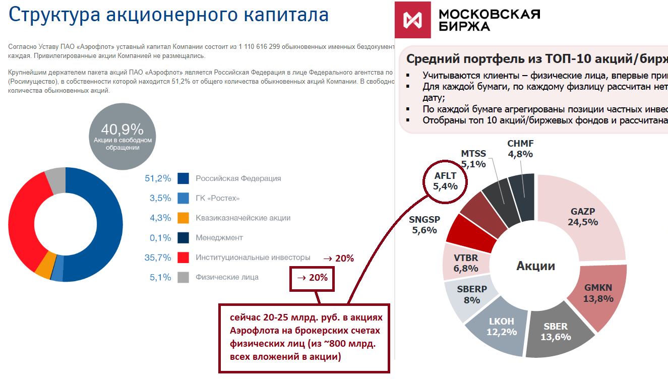 В последние полгода акции Аэрофлота стали очень популярными у физических лиц. Капитализация Аэрофлота маленькая (меньше 0,5% рынка), а в портфелях физиков Аэрофлот с мая 2020 вошел в топ-10 акций с весом 5.4% (до 3% всех вложений в российские акции у физиков на ~800 млрд.). На сайте Аэрофлота указана устаревшая информация (https://ir.aeroflot.ru/ru/securities/shareholder-capital/) о структуре акционеров. За год доля физических лиц могла вырасти с 5 до 15-20%, а количество акционеров с 70 тыс. до 1 млн. Известно, что только крупные участники (https://docs.google.com/spreadsheets/d/1wYOjuHCav06ZGc5K9zzJbERitwcRmppN2JtLOsoWzMo/edit#gid=1758035712) ТОП-30 продали c февраля акций Аэрофлота на ~7 млрд. руб. (~7% всех акций). Покупали скорее всего физические лица, активно идущие на биржу в последнее время. По данным НАУФОР (http://naufor.ru/tree.asp?n=19970) в 1 полугодии на биржу пришло 1,5 млн. клиентов, а их число превысило 5 млн.