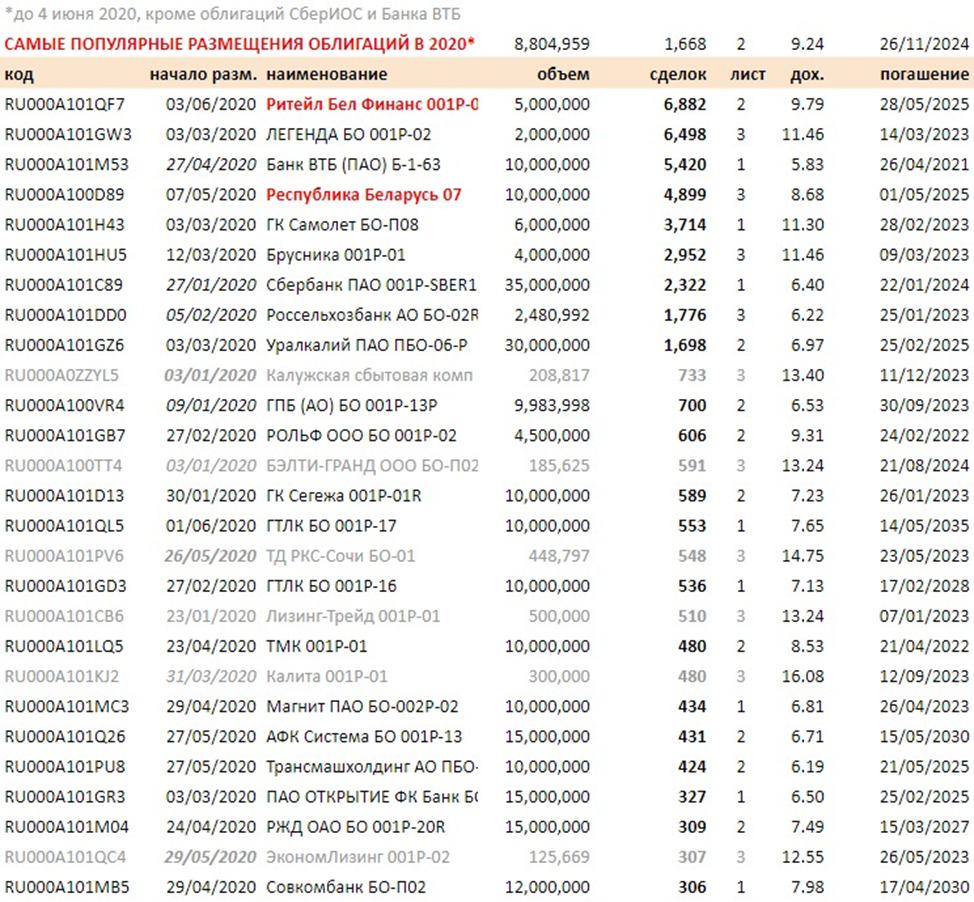 В таблице - рейтинг наиболее популярных по количеству участников первичных размещений на российском рынке в 2020. Конечно, рейтинг ничего не говорит об инвестиционной привлекательности и рисках, но показывает облигации, где изначально будет высокая ликвидность. На первом месте должны были быть народные ОФЗ с ~7,2 тыс. сделок с начала года - не включил их, так как там нет вторичного обращения и размещения идут постоянно, а не за 1 один день как у большинства корпоративных бондов. При размещении обычных ОФЗ на еженедельных аукционах проходит не более 100-200 сделок.
