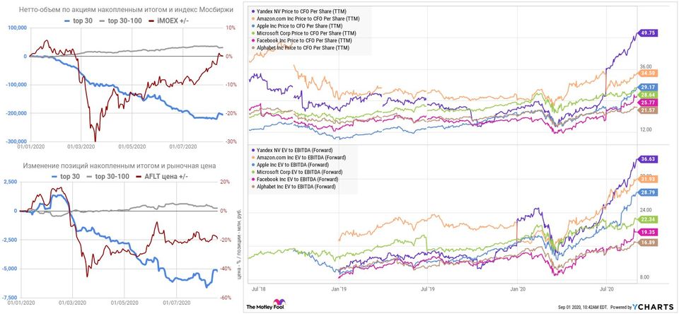 В конце августа статистика может быть искажена из-за пересмотра индекса MSCI. 31 августа в аукцион закрытия прошли рекордные обороты по акциям Yandex – за 5 минут акций на 75 млрд. руб. приобрели иностранные фонды (~5% в свободном обращении). Интересно, что по всем другим акциям, входящим в индекс, оборот составили менее 20 млрд. руб. – продажи от 0,1% до 0,3% акций в свободном обращении.