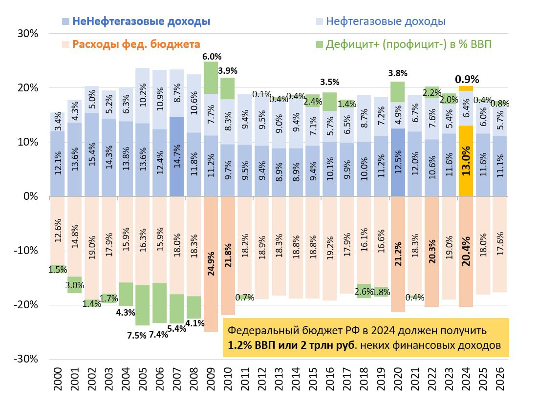 В целом схем много, чтобы получить небывалый с 00х объем ненефтегазовых доходов в 13% ВВП (23.5 трлн в 2024 из 35 трлн всего, после 16 в 2021-22 и ~19 в 2023) и показать сокращение дефицита бюджета. Вопрос для чего? Получается лишь для того, чтобы формально соблюсти приверженность бюджетному правилу и соответствовать ожиданиям Банка России.