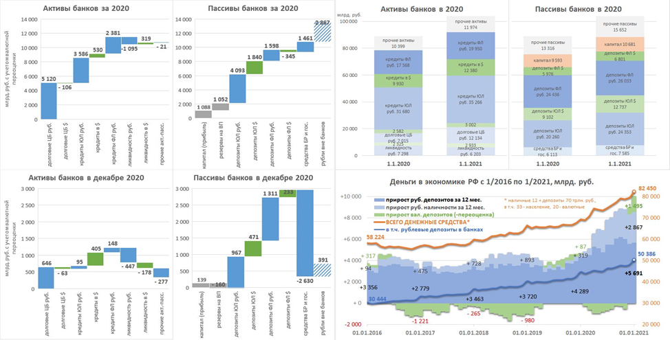 В декабре обычно происходят существенные изменения в банковских балансах из-за значительного бюджетного дефицита, роста расходов бюджета и перетока депозитов Правительства на счета частного сектора. Так, в декабре 2020 счета клиентов банков пополнились на +3372 млрд. (+2278 в рублях и +704 в инвалюте) – почти половина годового прироста безналичных средств +7186.