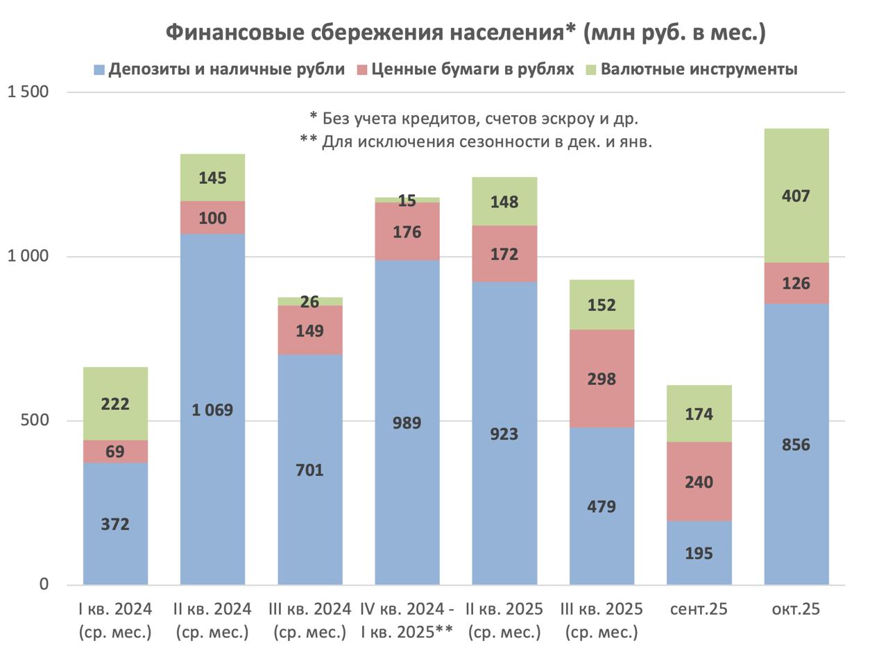 ▪️Рост корпоративного кредита (с облигациями) ускорился до 2,2 трлн (+2,3% м/м). Если исключить провал в сентябре на притоке валюты и погашении части рублевых кредитов, тренд идет с июля. С другой стороны заметно увеличение сбережений населения – снова >1 трлн в деньгах после провала в 3 кв. 2025 г.