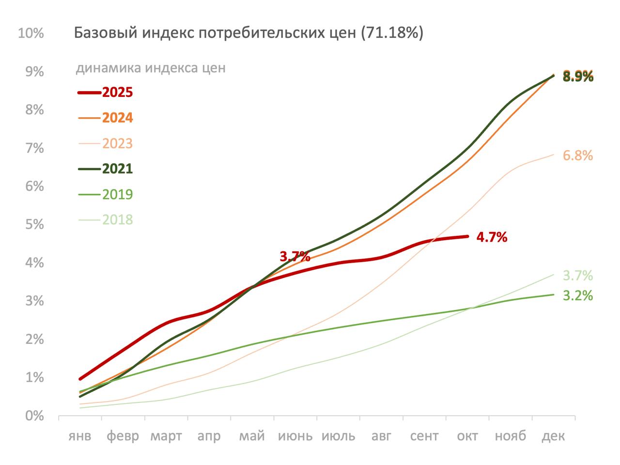 ▪️Медиана индексов цен по широкой корзине выросла в октябре с ~3 до 4,2%. Причина во многих продах, где есть сезонность.
