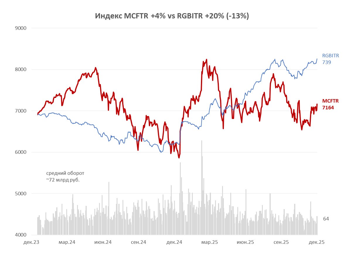 В 2025 году ОФЗ-ПД с фиксированным купоном (+22% по индексу RGBITR) существенно опередили рынок акций, включая дивиденды (+1% по индексу MCFTR). В условиях крепкого курса рубля и высокой реальной ставки (+10% к инфляции) акции могут продолжать отставать ещё какое-то время. Тем более, когда по длинным ОФЗ потенциальный доход за год может быть от 30% (за счет купонов и роста цены) при снижении ключевой ставки до 12% или ниже.