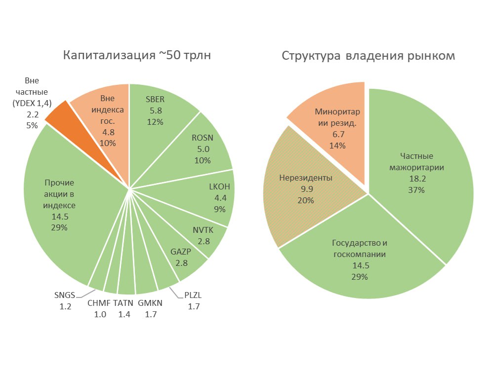 Общий Free Float рынка по индексу MOEXBMI ~33%, из них до 20% недоступно для торговли на Мосбирже и принадлежит нерезидентам (или частично резидентам во внешнем контуре). Более 14% капитализации на ~7 трлн свободно обращается на Мосбирже и принадлежит миноритарным акционерам-резидентам.