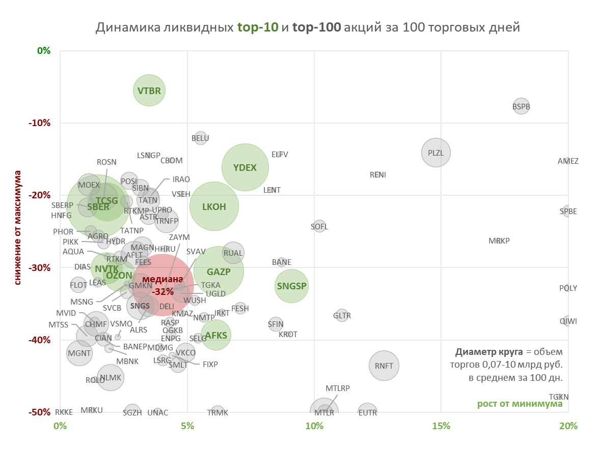 С максимумов в апреле рынок акций упал на 24% по индексу Мосбиржи 3500->2660. Капитализация широкого рынка MOEXBMI никогда не была так низко относительно ВВП (22%, или 42 от 191 трлн), если сравнивать со среднегодовыми значениями. По 100 ликвидным акциям снижение ещё больше ~32% по медиане от максимума за 100 дней.