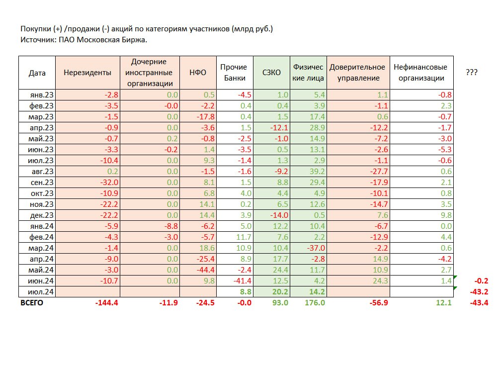 Нерезиденты до этого напрямую продавали стабильно и понемногу (144 млрд за 1,5 года или по ~9 млрд руб. в месяц). Но были две категории участников, где за покупками одних могли скрываться большие продажи тех, кто покупал у нерезидентов, – брокеры-НФО и доверительное управление.