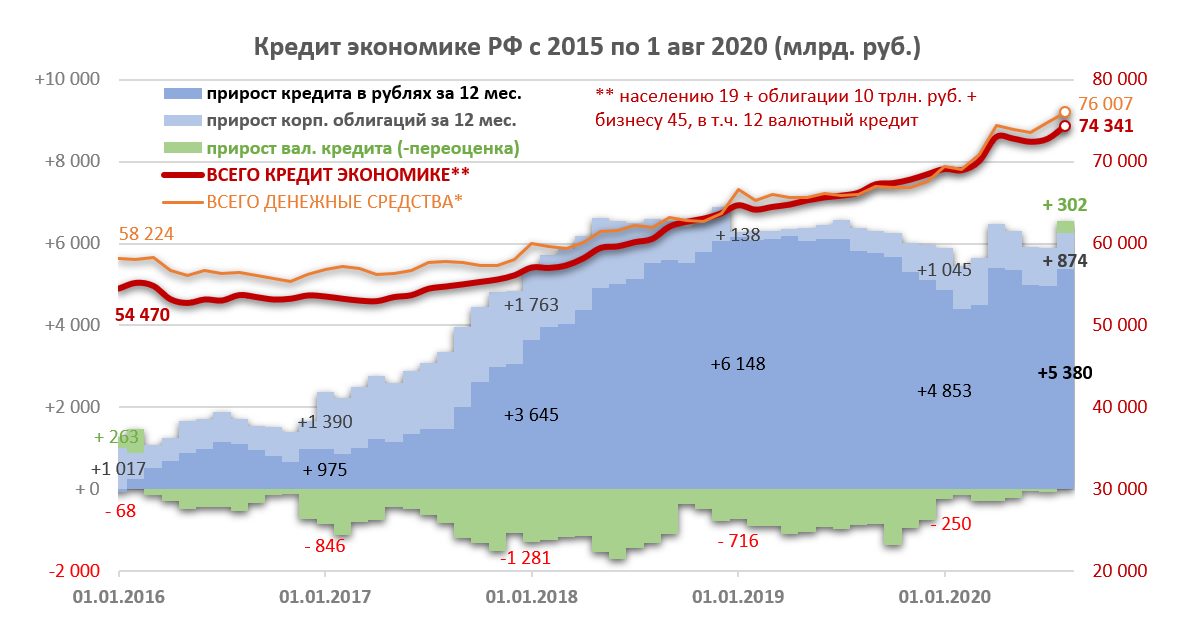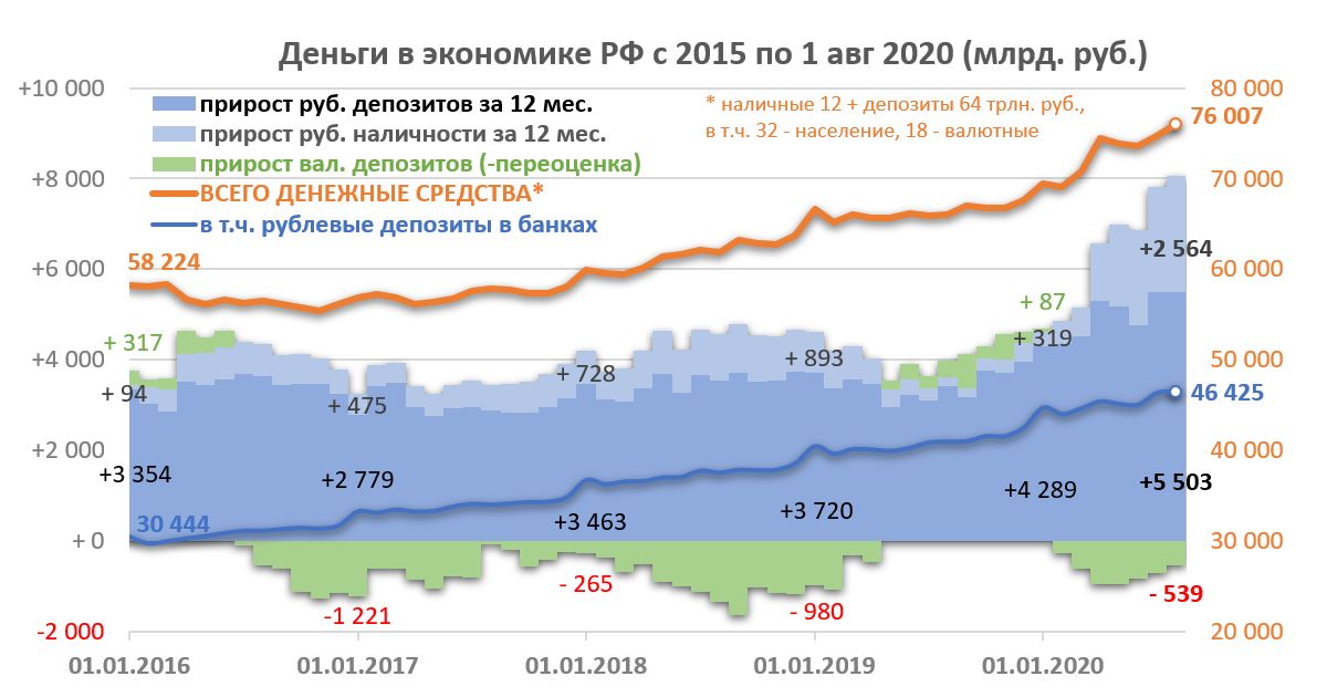 Банковский кредит – основной источник новых денег – с 2018 создает ~6 трлн. руб. в год. Разница между приростом денег и кредитов 4-6 в 2018-19 и 8-6 сейчас – из бюджетных доходов и расходов. Так, в прошлом бюджет работал с профицитом, накапливая не только валюту в ФНБ, но и рубли на счетах, в том числе от размещения ОФЗ в пользу банков. В этом году все наоборот – бюджетный дефицит больше привлечения денег с использованием госдолга. Например, региональные и прочие бюджеты в 1 полугодии 2019 сработали с профицитом 1 трлн., а в 2020 – с аналогичным дефицитом. Разницу взяли из остатков денег или получили из федерального бюджета в виде беспроцентных межбюджетных кредитов. Что будут делать во 2 полугодии, когда все бюджеты обычно работают с дефицитом, – большой вопрос, потому что практики рыночных заимствований в таких размерах у регионов нет. А политика партии (Минфина) не приветствует увеличение регионального долга.