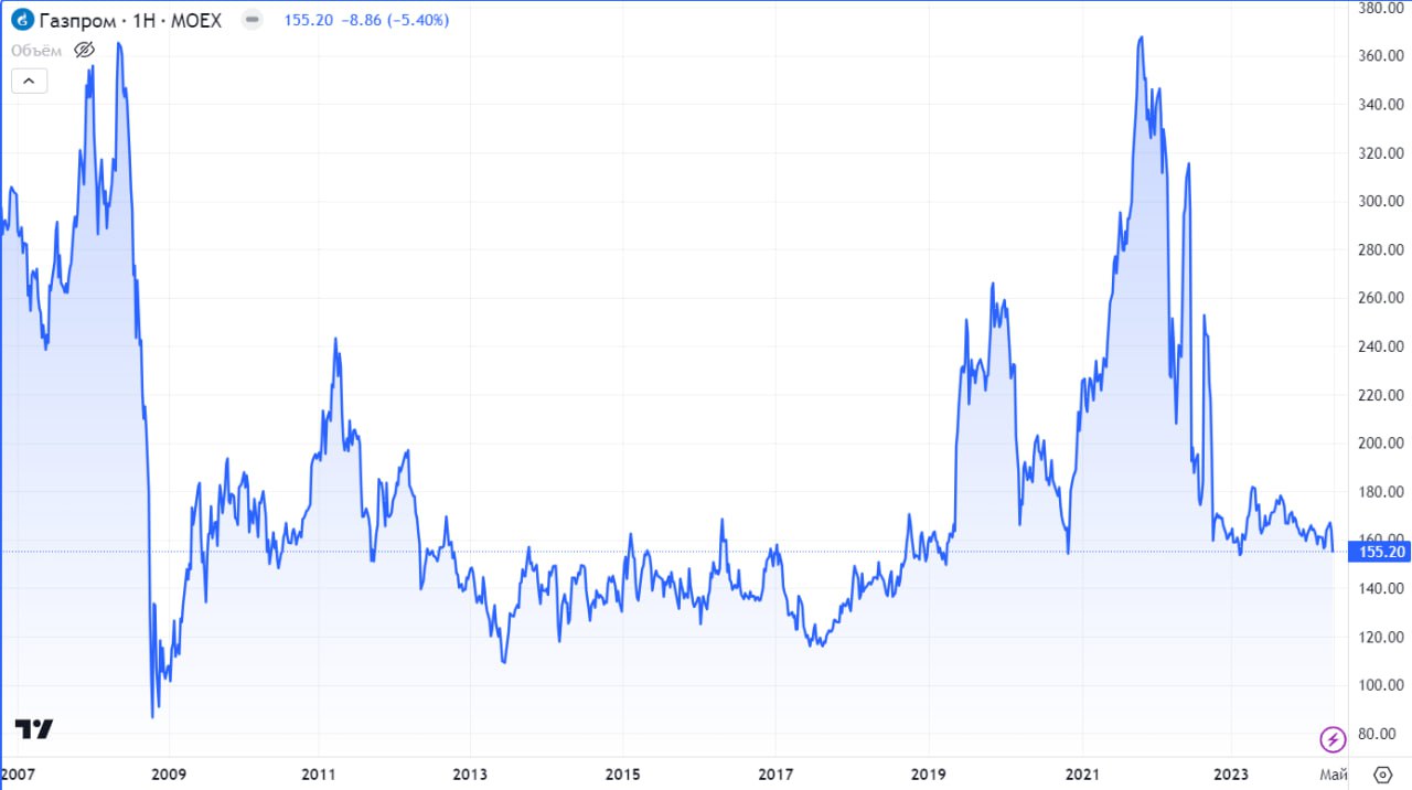 Акции Газпрома, если основной газовый бизнес убыточен, должны стремиться к нулю. Другие активы сейчас равны обязательствам ~7-8 трлн, если добавить акции Газпромнефти (~3,4 трлн по 750 руб.) и не считать, что в 2023 компания залезла в минус ~1 трлн по оборотному капиталу.