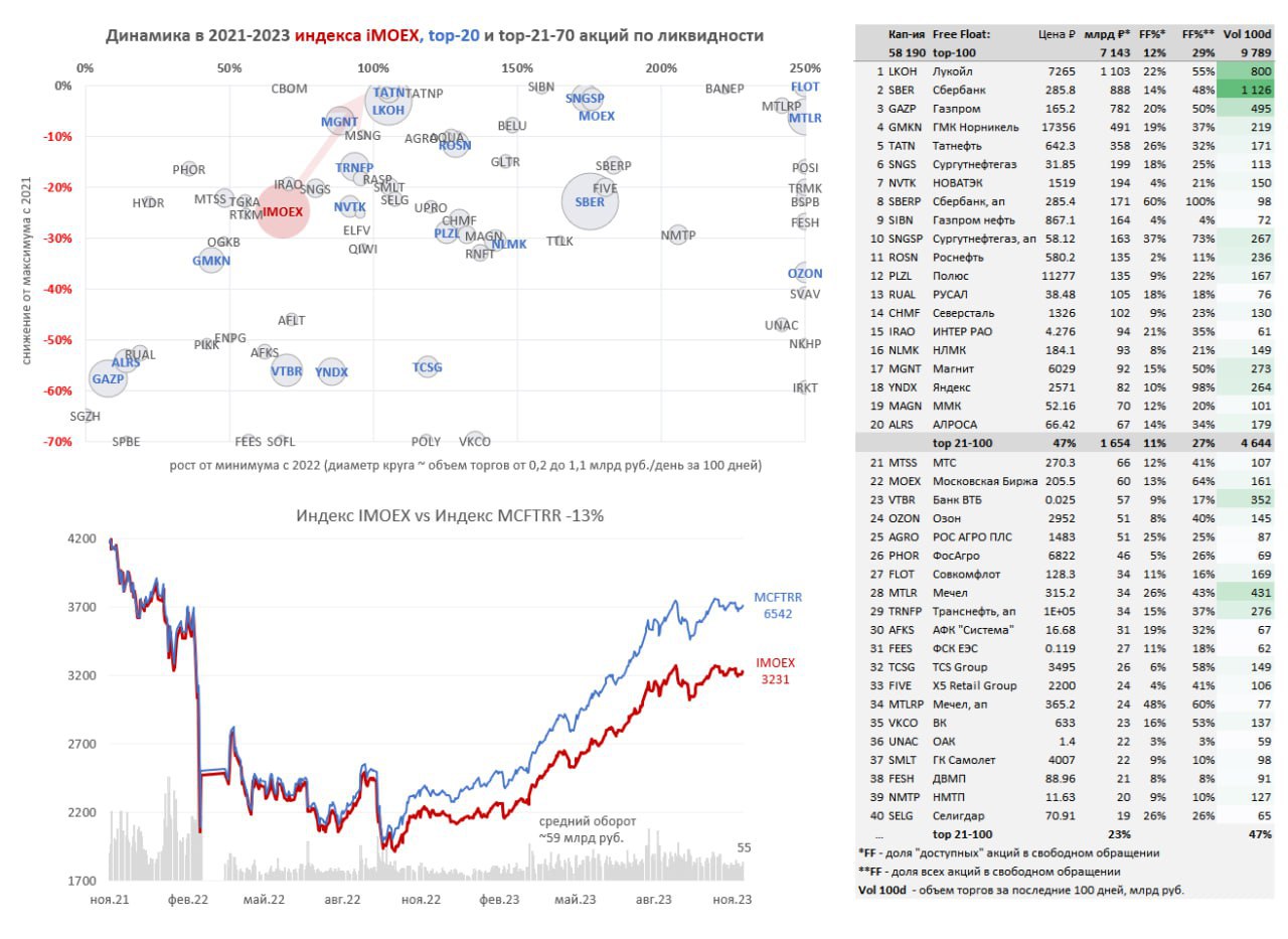 • Капитализация рынка ~58 трлн руб., если сложить топ-100 акций. Доступная капитализация лишь 12% или 7 трлн. Раньше Мосбиржа считала коэффициент Free Float, учитывающий акции в свободном обращении. А сейчас добавила коэффициент доступности, то есть только акции, которые находятся в российской инфраструктуре и доступны для торговли. Если средний FF как был, так и остался около 30%, то FF с учетом доступности только 12%. Коэффициенты можно найти в индексе широкого рынка MOEXBMI.