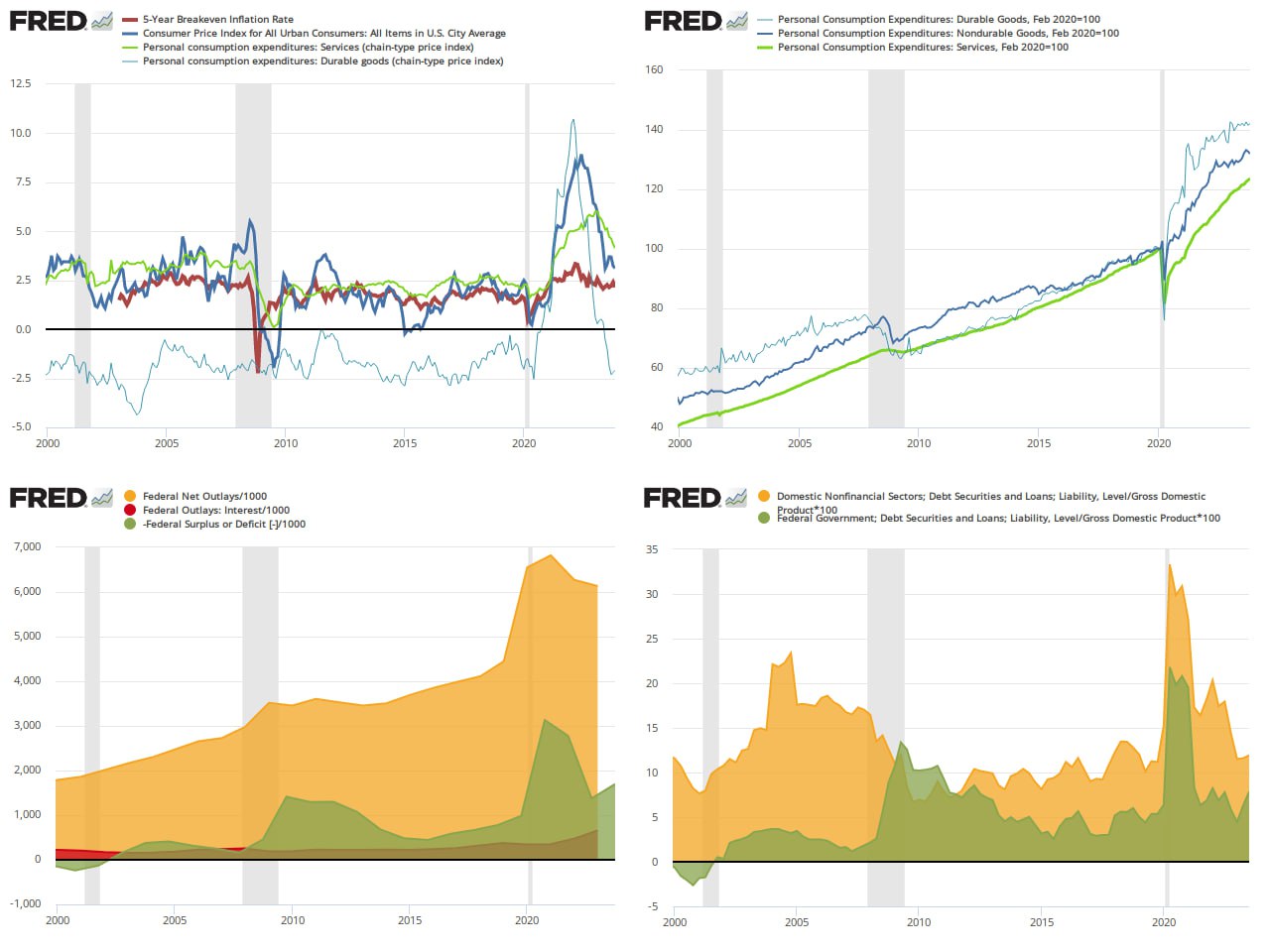• Общие расходы и дефицит бюджета США значимо выше доковидных. Но непроцентные расходы снижаются третий год подряд: 2019 – 4.1, 2020 – 6.2, 2021 – 6.5, 2022 – 5.8, 2023F – 5.7 трлн USD. В этом основная причина снижения инфляции, даже несмотря на высокий дефицит. Нет прироста расходов – нет и инфляции.