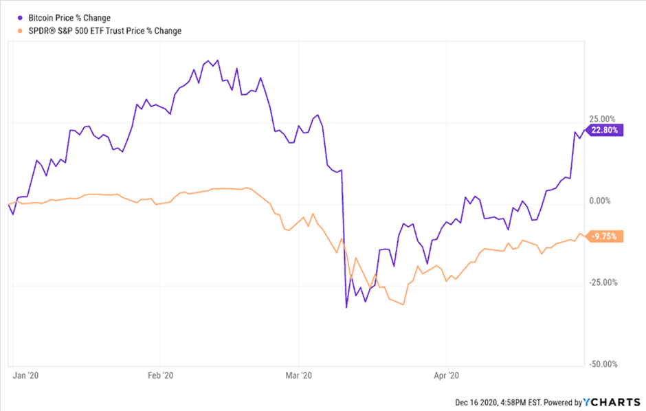 Несмотря на то, что биткойн-евангелисты утверждали в предыдущие годы, 2020 год окончательно доказал, что биткойн плохо работает на хаотичных рынках. Как и многие другие рисковые активы, цена биткойна быстро снизилась в марте 2020 года – на фоне падения других активов.