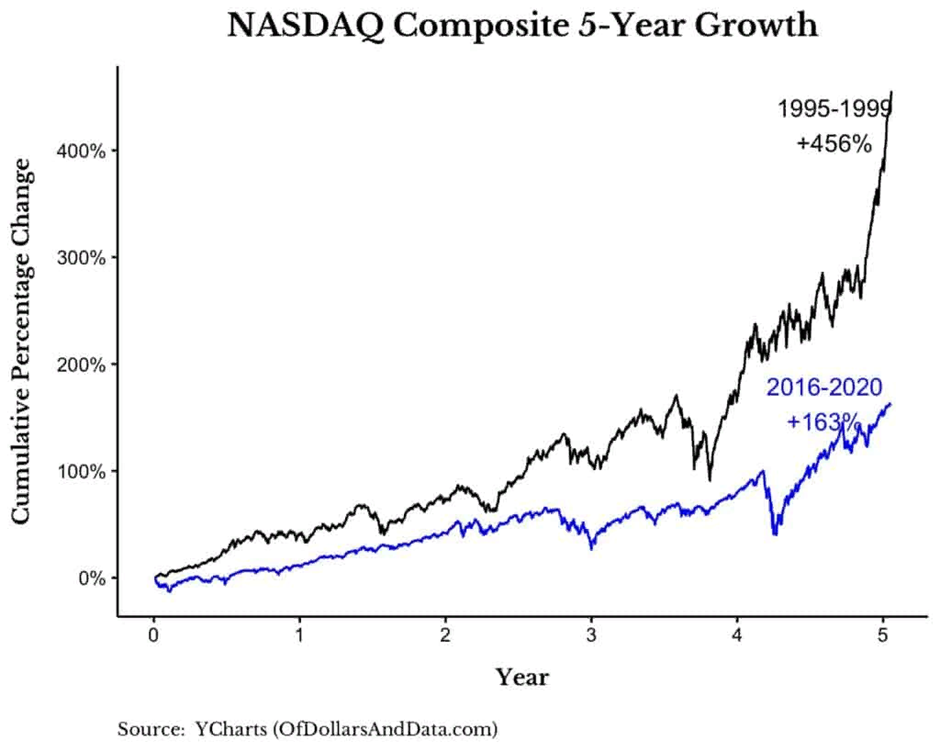 Учитывая множество сногсшибательных оценок различных технологических IPO в 2020 году, картина немного напоминает 1999 год и начало бума доткомов. Но обратите внимание на рост Nasdaq в течение 1995-1999 годов по сравнению с 2016-2020 годами, и вы увидите, что это день и ночь: