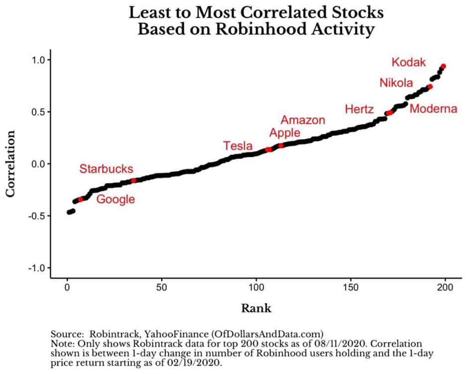 Наверняка многие помнят многочисленные статьи в СМИ про то, что трейдеры платформы Robinhood виновны в завышенных ценах на некоторые акции. В действительности, таким утверждениям не нашлось ни одного подтверждения. Большая часть эффекта торговой деятельности Robinhood, по-видимому, ограничивается отдельными акциями, особенно недорогими и имеющими небольшие объёмы торговли. В этом можно убедиться, изучив наименее и наиболее коррелированные акции, основанные на торговой активности клиентов Robinhood.