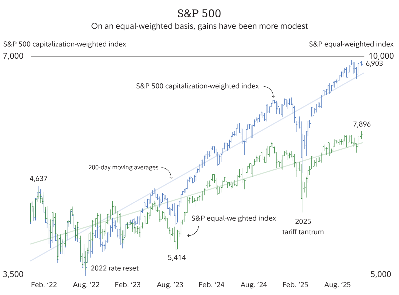 Что случилось с экономическим циклом, задался вопросом экономист. Дело в том, что нынешняя экономическая экспансия в США, которая началась после кратковременного, но серьёзного спада в начале пандемии в 2020 году, приближается к своему шестому году. По историческим меркам это долго, и этот экономический цикл совсем не похож на типичные. Мир прошёл путь от локдаунов из-за пандемии до масштабных стимулирующих мер, затем до инфляции и повышения процентных ставок, а теперь до инвестиционного бума, вызванного искусственным интеллектом. По состоянию на конец прошлой недели, когда индекс S&P500 достиг исторического максимума, с момента достижения минимума в 2022 году индекс вырос на 91%. Однако, если устранить влияние «Великолепной семёрки», то рост окажется куда скромнее: 52%.