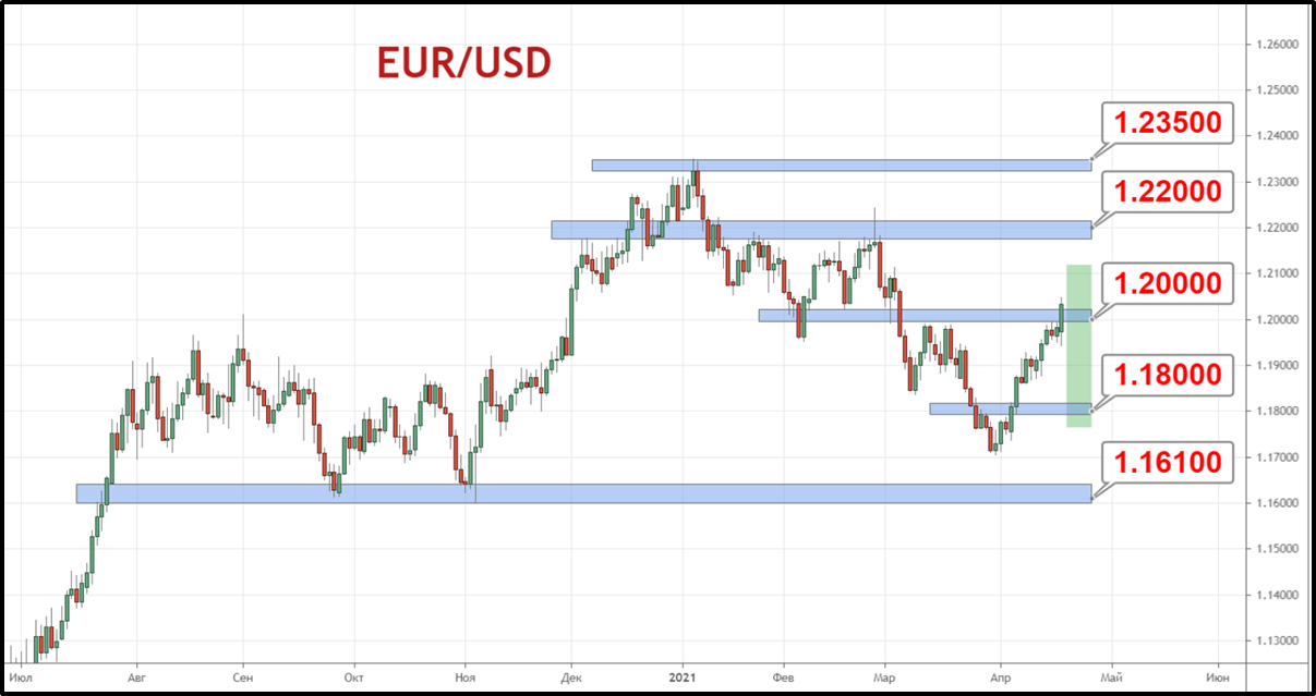 Пара EUR/USD продолжает рост от минимумов марта 1.1700 и стремится закрепиться выше сопротивления 1.2000. Поддержка находится в области 1.1800—1.1900.