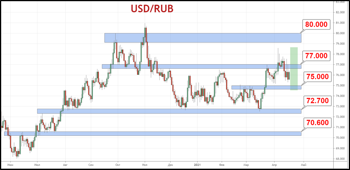 Пара USD/RUB торгуется в диапазоне 75—77 рублей, сохраняя настрой на рост в направлении 80 рублей.