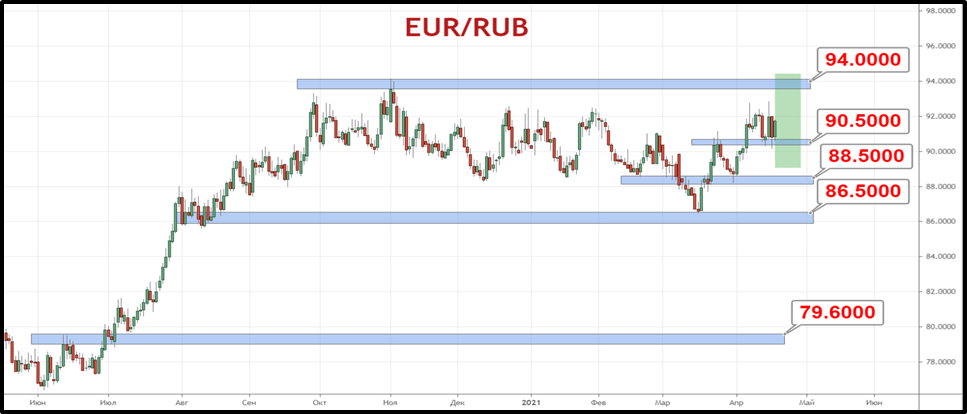 Пара EUR/RUB торгуется выше поддержки 90.50 рубля и нацелена на отметку к верхней границе диапазона отметке 94 рубля.
