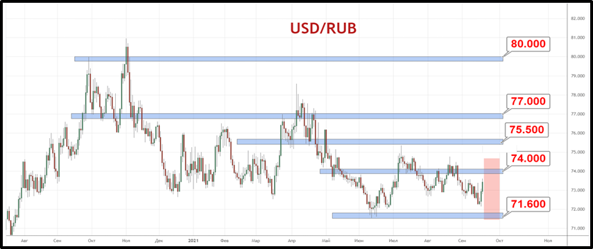 Пара USD/RUB развернулась вверх от области поддержки 71.60—72.20 рубля и взяла курс на сопротивление 74 рубля за доллар.