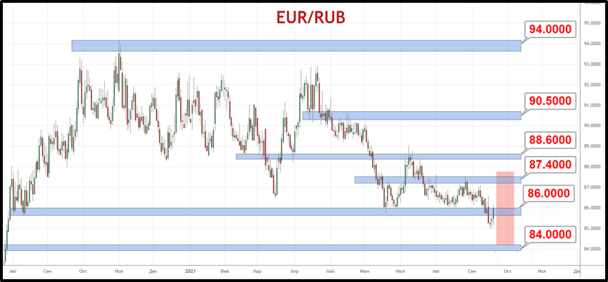 Пара EUR/RUB пытается вернуться выше сопротивления 86 руб. сохраняя общую тенденцию на снижение в направлении 84 рубля за евро.