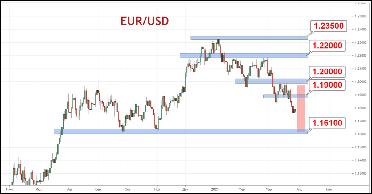Пара EUR/USD ускорила снижение от максимумов уровня 1.2350 в рамках медвежьего тренда. Котировки закрепились ниже сопротивления 1.1900—1.2000, что даёт рынку потенциал для падения к уровню 1.1600.