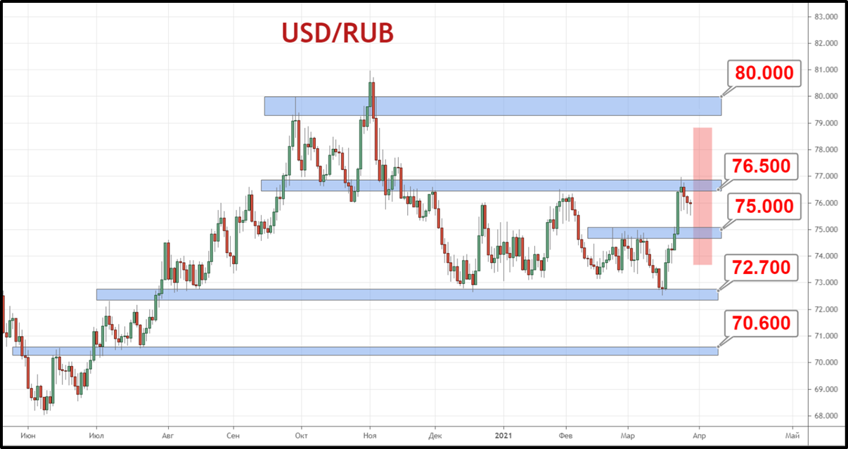 Российская валюта пережила самую волатильную недельную сессию за последние четыре месяца. В ожидании новых санкций после жёсткой риторики Байдена стремительно просел рынок государственного займа. Индекс RGBI упал до минимума марта 2020 (отметки 144 пункта), вызвав лавинообразное снижение рубля против доллара и евро. Пара USD/RUB вплотную приблизилась к 77, EUR/RUB выросла к отметке 91.15, после чего, ситуация стабилизировалась благодаря высоким ценам на нефть (баррель BRENT держится выше 65$) и неопределенности относительно дня, когда новые ограничения начнут действовать. Вероятно, временное ослабление политических рисков может помочь рублю отыграть утраченных часть позиций на этой неделе.