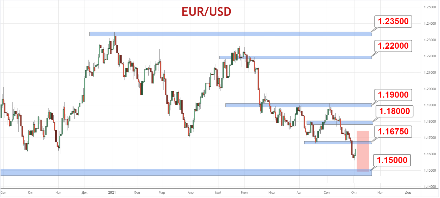 Единая валюта в паре с долларом завершила недельную сессию на новых годовых минимумах. Закрытие финансового года в США (отчётности формируют по итогам сентября) оказалось ниже отметки 1.1600, что создает риск более глубокого падения евро в горизонте 3–6 месяцев. Ралли на сырьевых рынках разгоняет инфляционные ожидания в США и ЕС, провоцируя власти к более решительным действиям в отношении программ стимулирования экономик. Индекс потребительских цен (CPI) ЕС за сентябрь вырос с 3% до 3.4% в годовом выражении, индикатор деловой активности в производственном секторе США от института управления поставками (ISM Manufacturing) составил 61.1 пунктов при прогнозе 59.9.