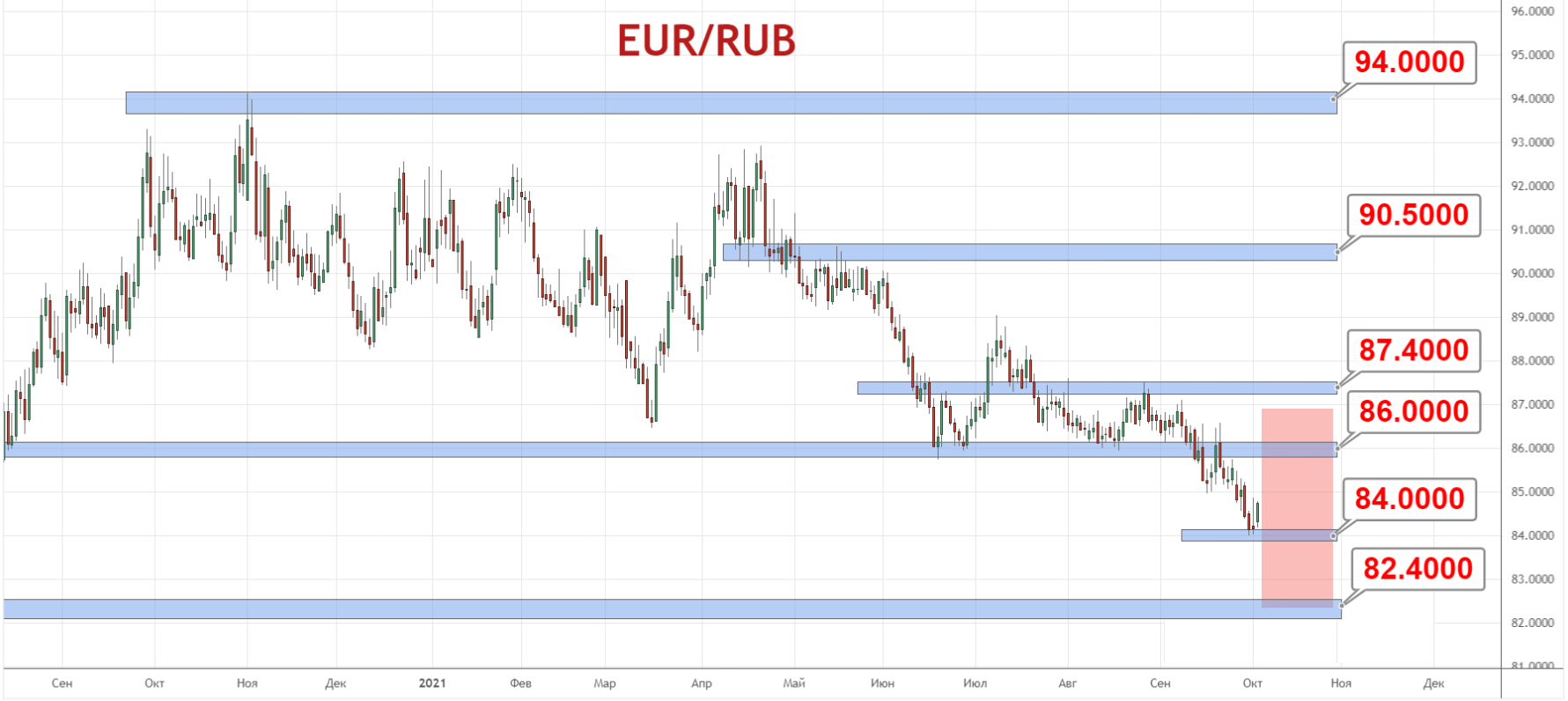 Пара EUR/RUB достигла ориентира 84 руб. и закрепляет сопротивление 86 руб. Новым ориентиром для продолжения медвежьего тренда выступает уровень 82.40 рубля за евро.
