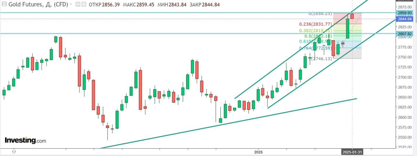 Поэтому деньги ищут спасение в надёжных защитных активах. И 30-31 января подскочили котировки золота до нового исторического максимума почти на $2860. Хотя до этого, в начале недели, казалось бы, уже откатывали вниз от $2800.
