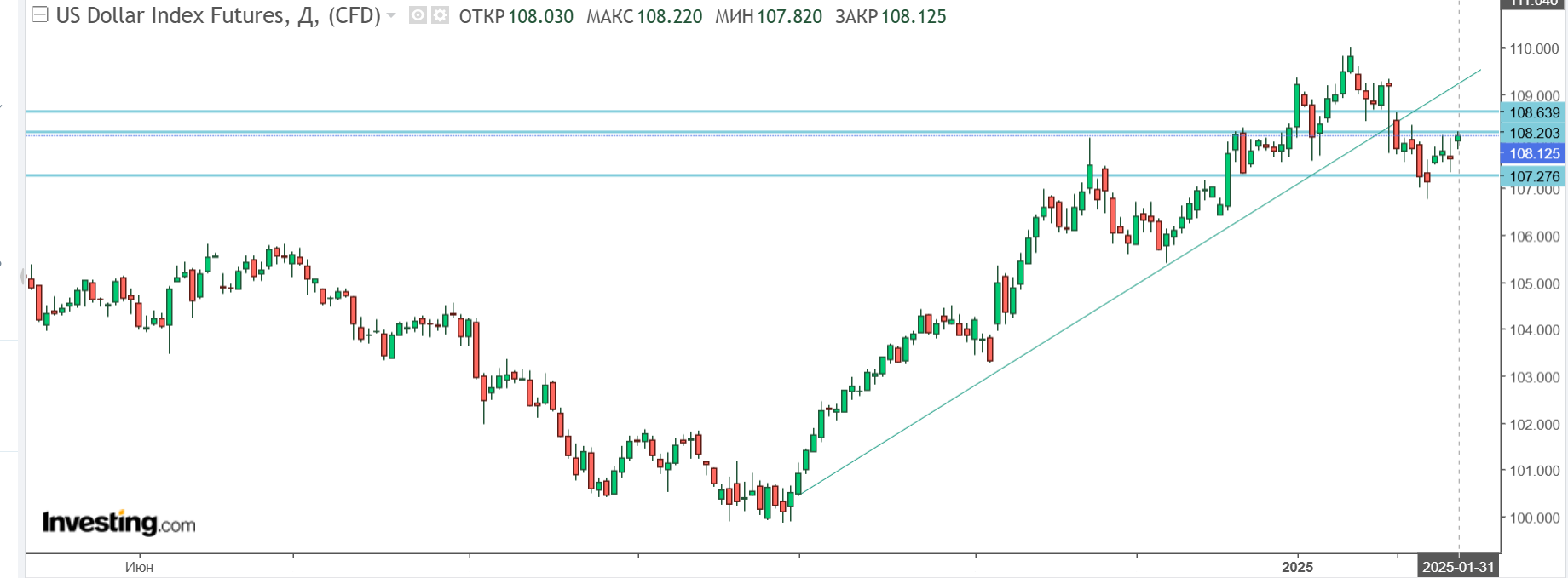 Доллар же тоже поднимается в последние дни, во многом из-за тех же тарифов Трампа. Их увеличение снизит приток импортных товаров в США, уменьшит поэтому спрос на иностранные валюты в Штатах, что благоприятно для доллара. Кроме того, уменьшение наполнения внутреннего рынка ослабит конкуренцию, американские производители смогут поднять цены. Возможный по данным причинам всплеск инфляции может усилиться за счёт снижения налогов и роста бюджетных расходов. Это способно заставить ФРС замедлить снижение ставки. Недаром, недаром её глава Джером Пауэлл был осторожным и достаточно жёстким на заседании 29 января. В то время, когда другие ведущие центробанки (кроме Банка Японии) настроены на более весомое смягчение, уменьшение ставок. Пример – конечно же срезание ставки ЕЦБ 30 января до 2,9% с 3,15% на фоне падения в еврозоне квартальных темпов роста ВВП в 4 квартале до нуля с 0,4% Да еще при усилении в декабре безработицы до 6,3% с 6,2%. Такие условия также укрепляют индекс доллара.