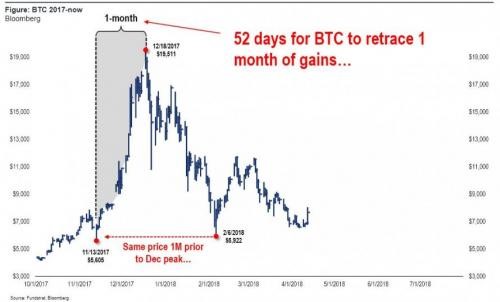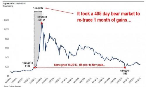 Достаточно интересной информацией поделился Том Ли из Fundstrat Global. С октября по ноябрь 2013 года биткоин взлетел в цене на 621%, и понадобилось 405 дней падения для перекрытия этого одномесячного роста.