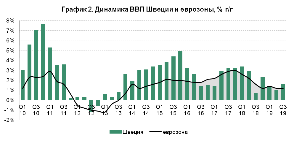 19 декабря 2019 года ЦБ Швеции или Риксбанк вывел ставку по краткосрочным кредитам коммерческим банкам в рамках операций РЕПО из отрицательной территории, повысив её значение на 25 б.п., с -0,25% годовых до 0% годовых. Ставка по операциям РЕПО держалась на отрицательном уровне с 12 февраля 2015 года, когда регулятор понизил её с 0% годовых до -0,1% годовых, постепенно понижалась и достигла минимального уровня в -0,5% годовых 11 февраля 2016 года, а 20 декабря 2018 года была повышена на 25 б.п., с -0,5% годовых до -0,25% годовых. За исключением нескольких месяцев за этот период потребительская инфляция в Швеции превышала потребительскую инфляцию в еврозоне. За первые 11 месяцев 2019 года показатель оказывался в среднем на 0,6 п.п. выше, нежели показатель в еврозоне. В ноябре 2019 года индекс CPI в Швеции расширился на 1,8% г/г при увеличении аналогичного показателя в еврозоне на 1% г/г.