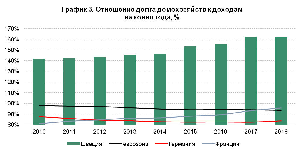 Согласно заявлениям Риксбанка, ставка РЕПО останется неизменной как минимум до начала 2021 года, в то время как её текущий уровень всё еще позволяет называть проводимую кредитно-денежную политику ультрамягкой. Основные опасения регулятора связаны с закредитованностью шведских домохозяйств – чрезмерно быстрое повышение ставок на рынке может остро отразиться на способности населения покрывать свой долг, в том числе обеспеченный ипотекой. За период 2015-2018 гг. отношение долга домохозяйств к их доходам в Швеции увеличилось почти на 10 п.п. и достигло к концу 2018 года 162%. Для сравнения аналогичный показатель в еврозоне и в её крупнейших членах, Германии и Франции, не превышает 100%. Подобная ситуации наблюдается также в Италии и Испании.