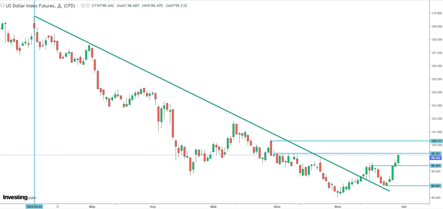 Технически доллар по индексу поднялся к сильному сопротивлению 99,4 п., уровню конца мая. Отыграл назад всё падение за два месяца. Да доллар на кураже. В случае пробития вверх 99,4 п. и закрепления выше откроется путь к принципиальному уровню 100 п. И это будет означать слом всего полугодового нисходящего тренда с февраля 2025 года. Ключевой момент , может быть, всего года!