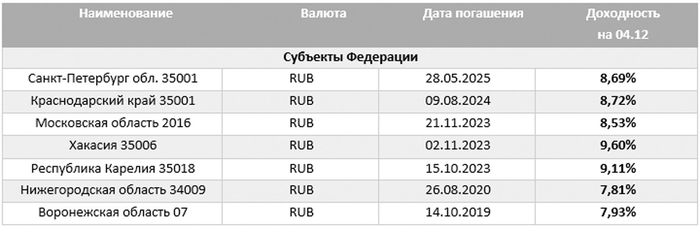 Доходности субфедов постепенно осваивают 8%-ный уровень и частично уходят ниже. При ключевой ставке 7,5%, 5-7-летние бумаги, предлагающие сегодня 8-9% годовых – это хорошо для вложений (как мы думаем). Ожидаемое многими экспертами повышение ставки Банка России 14 декабря до 7,75% или даже до 8% (считаем 8% для декабря нереалистичным сценарием), если и состоится, по нашему прогнозу, не ударит по ценам таких бумаг, оно, как говорится, в цене.