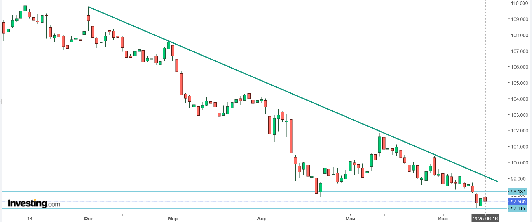 Такие реалии привели к стабилизации доллара и консолидации его в диапазоне 97,1 – 98,2 п. в рамках сохраняющегося нисходящего тренда. Дело осложняется тем, что ведь уже в среду 18 июня будет заседание Федрезерва. И он в сложном положении. Ожидавшаяся более мягкая риторика может не состояться. Да и что, какие сюрпризы принесут эти дни с Ближнего Востока? Кроме того, до четверга пройдут и заседания Банка Англии, ЦБ Швейцарии.