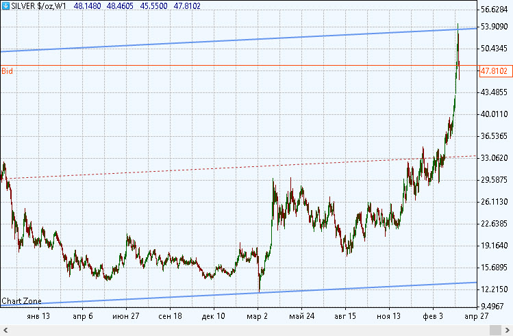 «Белые» металлы на фоне коррекции золота выглядят сильно. И серебро, и платина, и палладий с начала недели обыгрывают золото, что указывает на сохраняющуюся силу рынка и является доводом в пользу нашего предположения, что коррекция в золоте близка нижней точке. Серебро удержало уровень $46, и в этом случае уже можно с хорошей долей уверенности говорить, что он выступит теперь среднесрочной поддержкой (см. график 3).