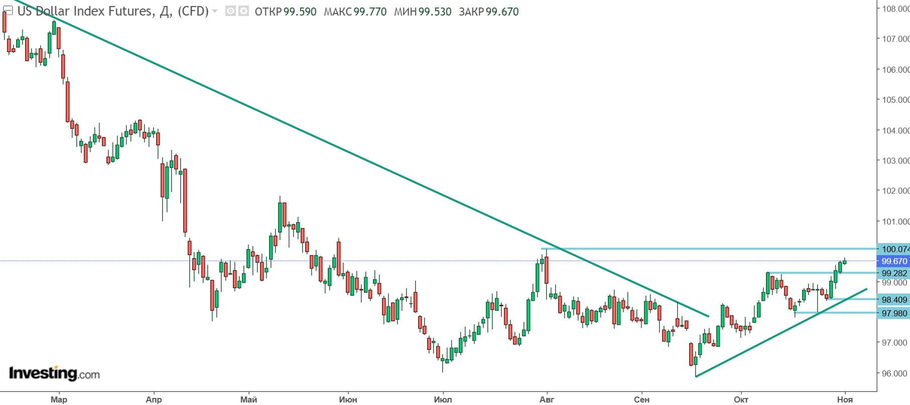 Оправдался мой прогноз в Finversia 27 октября: «В случае относительно «ястребиных» посылов ФРС, доллар может пойти вверх. Если уйдёт выше сопротивления 99 п, актуально станет движение к 99,3 п.» Да, после ФРС показатель с 98,4 п. вырос выше 99 п. и достиг 99,3 п.