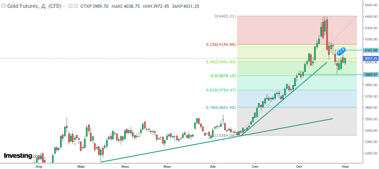 Для золота укрепление доллара в третьей декаде октября стало одной из главных причин резкой коррекции. Она дошла с $4400 ниже $3900. Это как раз 50% по Фибоначчи от последнего импульса аптренда. Актив «разрядил» избыточную перекупленность. Но основные факторы подъёма не ушли. А именно будущее снижение ставки, геополитика и её риски, покупки золота в резервы центробанками. Остаётся на среднесрок потенциальная направленность вверх. Об этом говорит и то, что в последние дни цена снова выше $4000, несмотря на укрепление доллара.