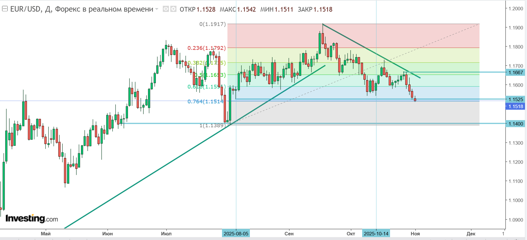 Евро слабеет вслед за укреплением доллара и из-за политических и долговых рисков в странах еврозоны. Пара EUR/USD пытается уйти ниже сильной поддержки 1,1530 – предыдущего минимума и уровня Фибо 76,4%. О ней тоже писал в Finversia 27 октября. Если удастся закрепиться ниже 1,1530, вероятно движение в район 1,14–1,1420. По евро борьба двух трендов – общий восходящий 2025 года и локальный нисходящий октябрьский. Возможно движение вверх при изменении ситуации с долларом, возобновлении мягкости ФРС. Это может быть технически от рубежей 1,14-1,1420 или при незакреплении ниже 1,1530. Сопротивление – на 1,1660.