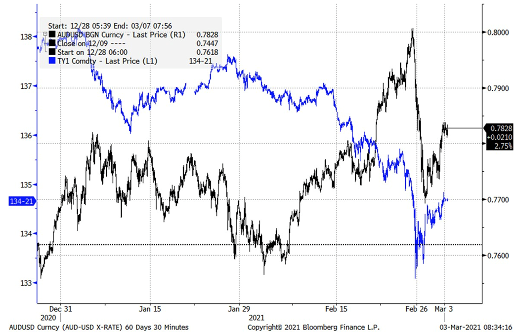 График: AUDUSD и казначейские облигации США